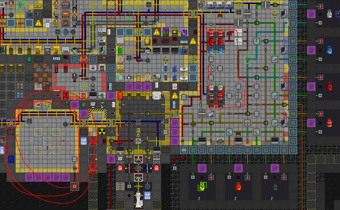 There is a HFR area, circled in the bottom left, just past the turbine. Not a fantastic location but there weren’t many fantastic locations as I designed the map before the HFR was added. My main idea for atmos techs was they could easily remove the directional windows in the squared area for a small space for other projects. The other pipes to the right are all layer 3 so there is room to expand to the right with other layers. I’m no atmos expert but this seems like enough area to me for most projects, plus the HFR room is quite large, so it could be used for custom projects if the HFR is not built.